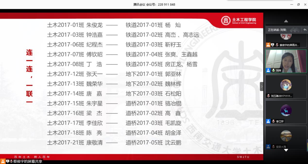 为加强峨眉、犀浦两校区土木2017级学生的沟通交流,2020年5月14日晚19:00,1066vip威尼斯2017级班长见面会在线上召开,1066vip威尼斯辅导员刘萍、蔡俊宇、张进、李江怀、王黎,竺可桢书院王琼、唐涵老师,2017级土木工程、铁道工程、城市地下空间工程、道路桥梁与渡河工程四个专业的全体班长、部分团支部书记参与了会议。