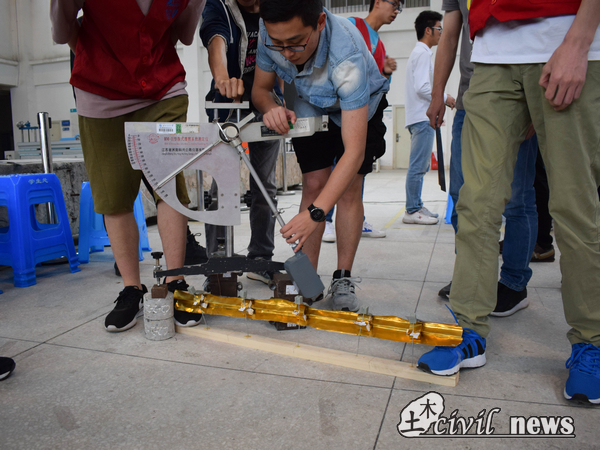具体比赛流程是按签到顺序依次出场,在选手用自备的PPT答辩时,工作人员先对模型的规格进行检测,符合要求后对模型进行加载。加载方式是采用850克的重锤,用50厘米的摆臂从水平位置摆下,重锤外形仿照汽车外轮廓,并以30度斜角撞击防护栏表面,这是为了尽可能模拟车辆撞击时的真实情况。撞击后记录防护栏横向最大形变(精确到毫米),由评审专家评定防护等级A~E级。选手的理论方案书包括:设计依据,模型结构构成和模型总图等。评委专家会在答辩期间提问,这让同学们有点紧张,常常感到措手不及。